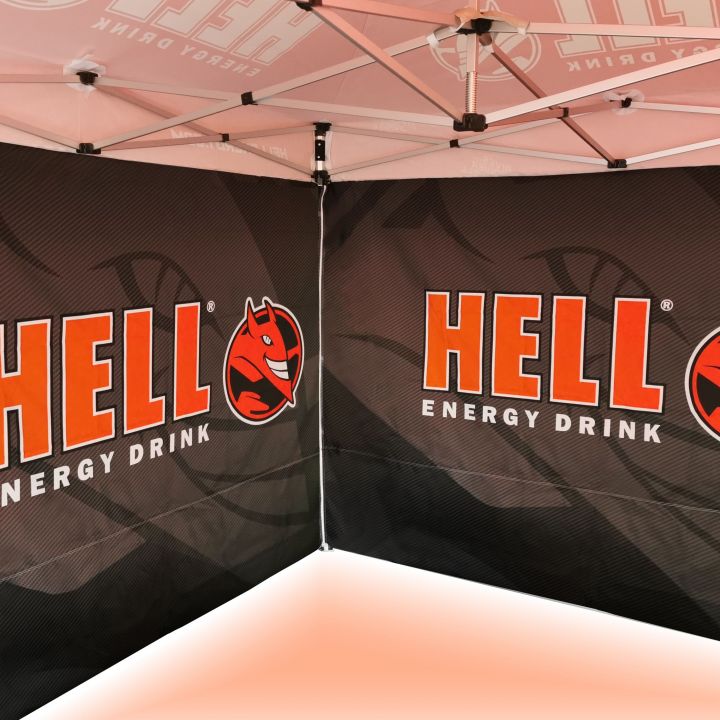 Διαφημιστικές σκηνές με ψηφιακή εκτύπωση υπολυβιασμού. Η εκτύπωση δημιουργείται μέσω χημικής διαδικασίας, όπου μελάνι διεισδύει κατευθείαν στη δομή του υφάσματος υπό την επίδραση υψηλής θερμοκρασίας. Λογότυπο, κείμενο ή οποιοδήποτε είδος γραφικών στο εσωτερικό ή εξωτερικό μέρος της σκηνής σύμφωνα με τις επιθυμίες του πελάτη.