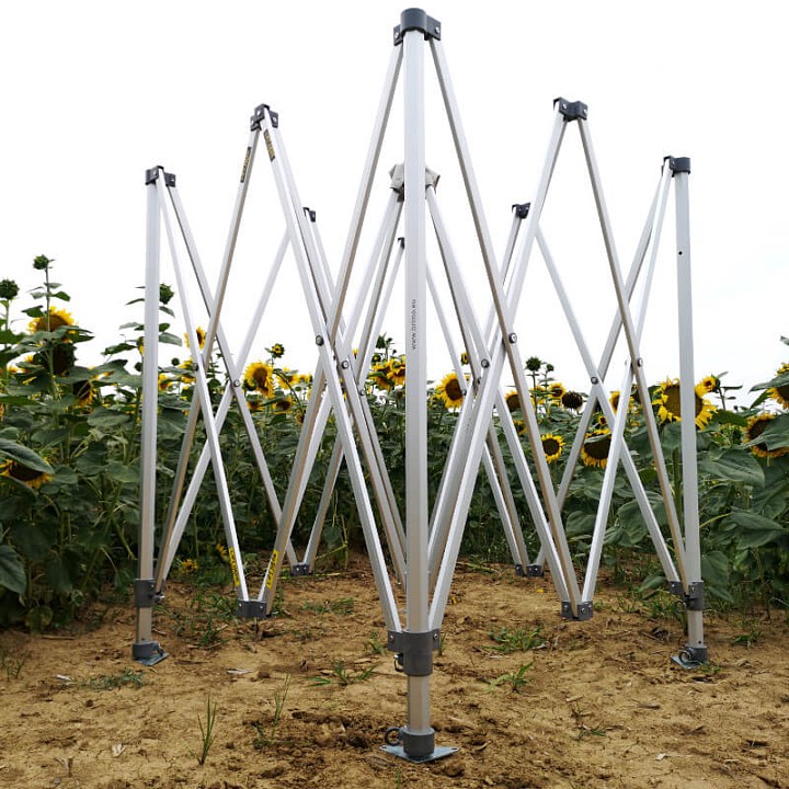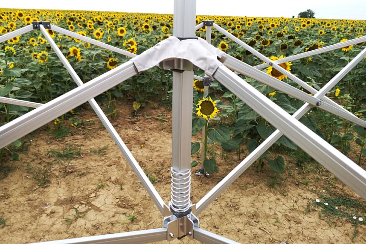 Παρά τις διαστάσεις της, ο χειρισμός της σκηνής είναι αστραπιαίος. Χάρη στο ψαλιδωτό σύστημα, η συναρμολόγηση και η αποσυναρμολόγηση δεν είναι καθόλου δύσκολη – για την έκπτυξη αρκούν ένα έως δύο άτομα. Η κατασκευή είναι κατασκευασμένη από ανοδιωμένο αλουμίνιο. Αυξάνοντας το πάχος των εσωτερικών προφίλ στα 1,8 mm, επιτεύχθηκε τέλεια σταθερότητα και υψηλή δομική αντοχή. Τα στιβαρά εξαγωνικά πόδια εξασφαλίζουν ότι το σύνολο στέκεται σταθερά ακόμα και σε ανώμαλο έδαφος (με σωστή αγκύρωση).