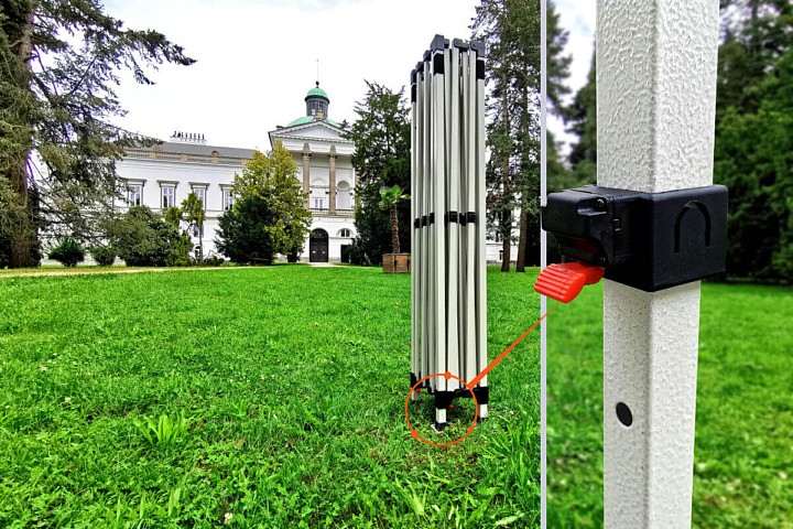 Το πτυσσόμενο σύστημά μας δεν απαιτεί κανένα εργαλείο ή εξειδικευμένες γνώσεις. Χάρη στον έξυπνο μηχανισμό, δύο άτομα μπορούν να στήσουν τη σκηνή μέσα σε λίγα λεπτά. Όλες οι συνδέσεις είναι βιδωτές, επιτρέποντας την εύκολη αντικατάσταση μεμονωμένων εξαρτημάτων σε περίπτωση ανάγκης – σε αντίθεση με τις φθηνές εκδόσεις με πριτσίνια.