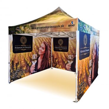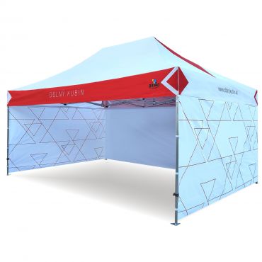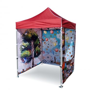 Διαφημιστικές σκηνές με ψηφιακή εκτύπωση υπολυβιασμού. Η εκτύπωση δημιουργείται μέσω χημικής διαδικασίας, όπου μελάνι διεισδύει κατευθείαν στη δομή του υφάσματος υπό την επίδραση υψηλής θερμοκρασίας. Λογότυπο, κείμενο ή οποιοδήποτε είδος γραφικών στο εσωτερικό ή εξωτερικό μέρος της σκηνής σύμφωνα με τις επιθυμίες του πελάτη.