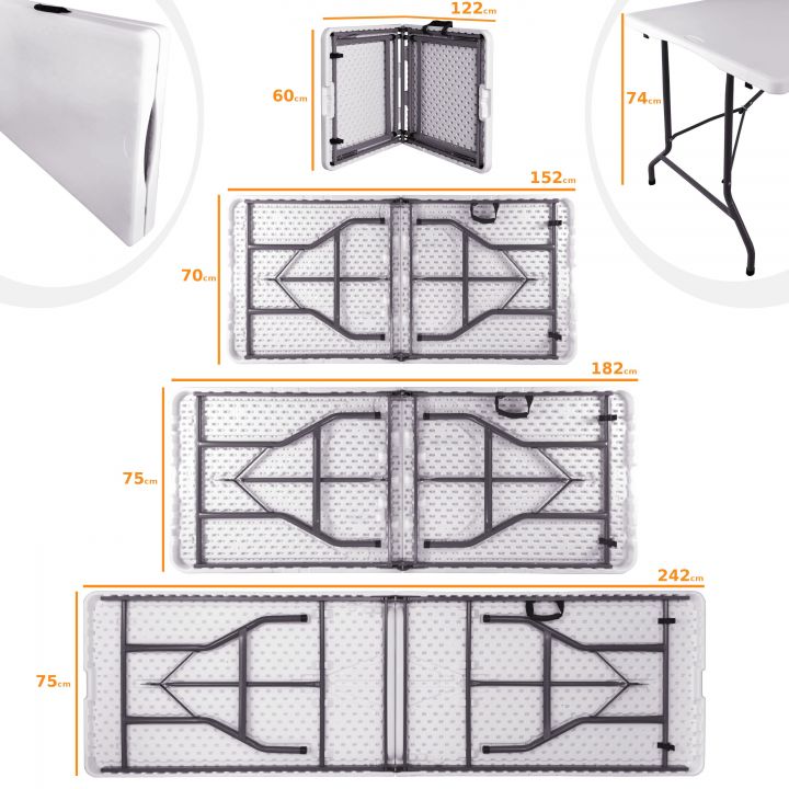 Η επεξεργασία της επιφάνειας του τραπεζιού είναι επίσης σημαντική. Για παράδειγμα, μια επιφάνεια από HDPE είναι εξαιρετικά ανθεκτική, ανθεκτική στις γρατζουνιές και εύκολη στον καθαρισμό. Τα κύρια πλεονεκτήματα ενός πτυσσόμενου τραπεζιού είναι η ευκολία στη συναρμολόγηση και αποθήκευση. Το τραπέζι καταλαμβάνει ελάχιστο χώρο όταν διπλωθεί. Είμαστε κατασκευαστές τραπεζιών που δηλώνουν ξεκάθαρα το βάρος και τις διαστάσεις κάθε μοντέλου, ώστε να μπορείτε να επιλέξετε το κατάλληλο για τις ανάγκες σας.
