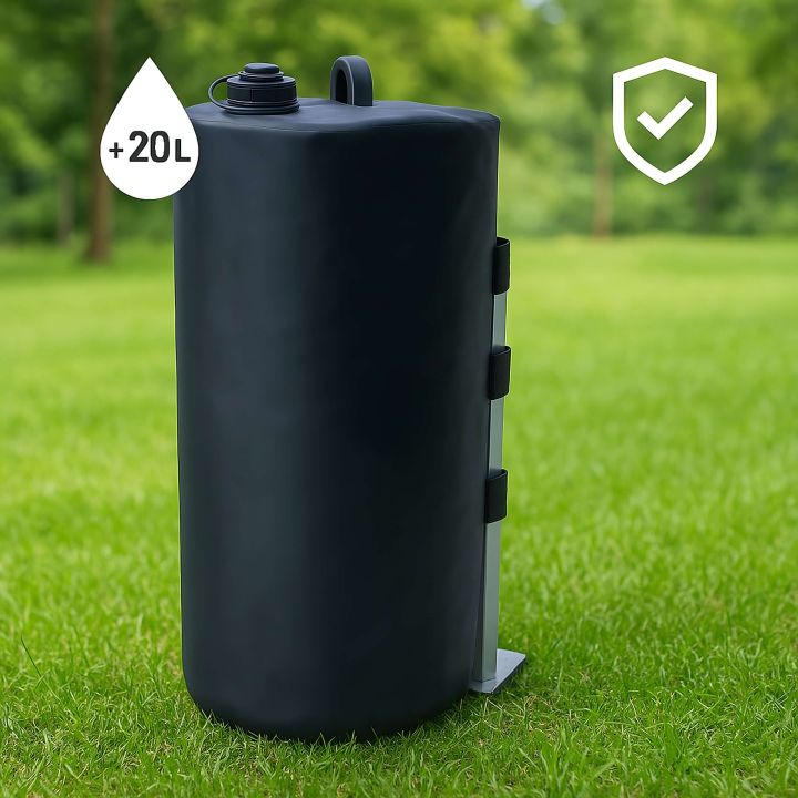 Χωρητικότητα 20 λίτρων – Αφού γεμίσει με νερό, το βάρος φτάνει τα 20 kg, εξασφαλίζοντας την κατάλληλη σταθερότητα ακόμα και σε ισχυρούς ανέμους.